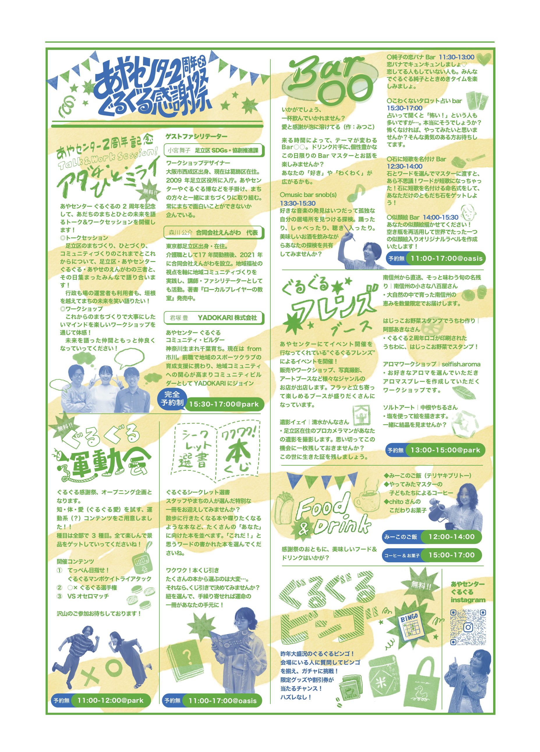 2周年を記念したトーク&ワークセッション、いつもあやセンターを盛り上げてくれる「ぐるぐるフレンズ」たちによる出店ブースやBarの開店、他にも見どころ・参加しどころ満載です!
