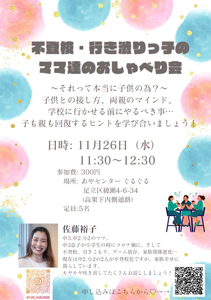 【11/26開催】不登校・行き渋りっ子のママ達のおしゃべり会